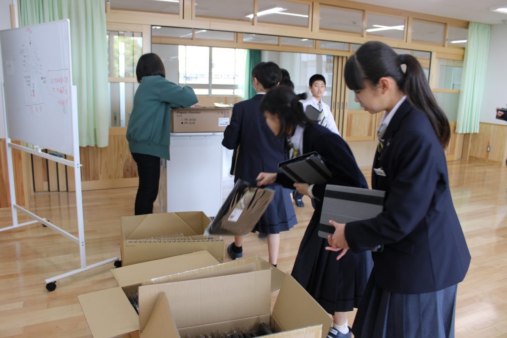 本日、学習用タブレットの配付を行いました。受け取った児童生徒たちは、新しいタブレット型PCに目を輝かせ、これからの学びへの期待が高まっている様子でした。